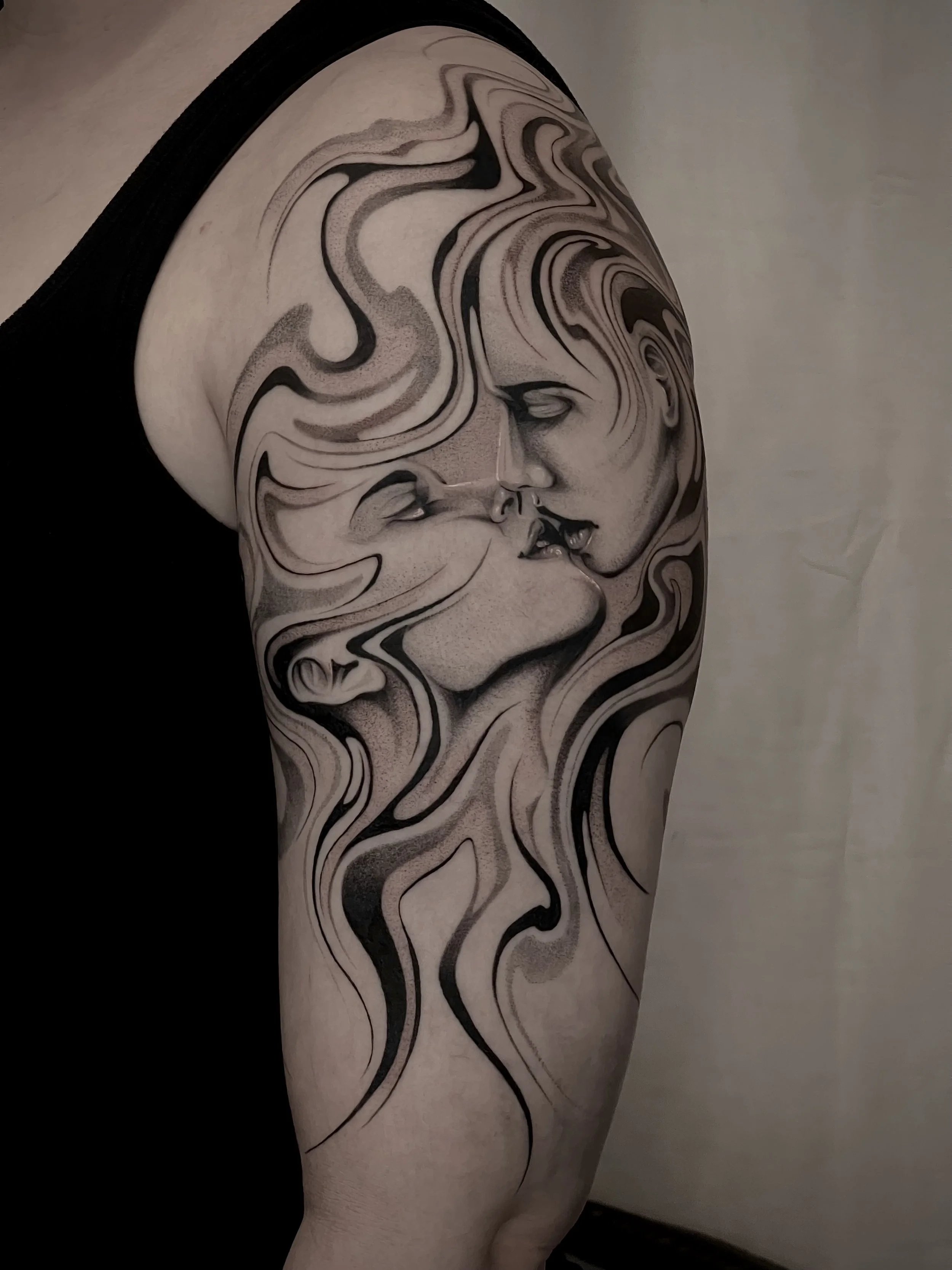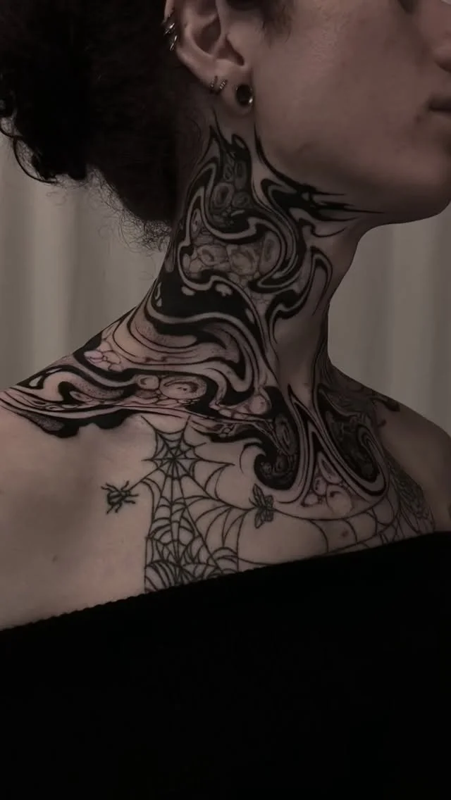 Hello! I’m Tylar (he/they), a Melbourne/Narrm based tattoo artist working at Seven Saints Tattoo studio. I gravitate towards dark surrealism and abstract blackwork, centring contrast and flow in my work. Some of my favourite things to tattoo are distorted portraits and animals, anatomy and bones, and anything dark and abstract. I love tattooing for the art, the technicality, and the opportunity to help people feel more at home in their bodies.